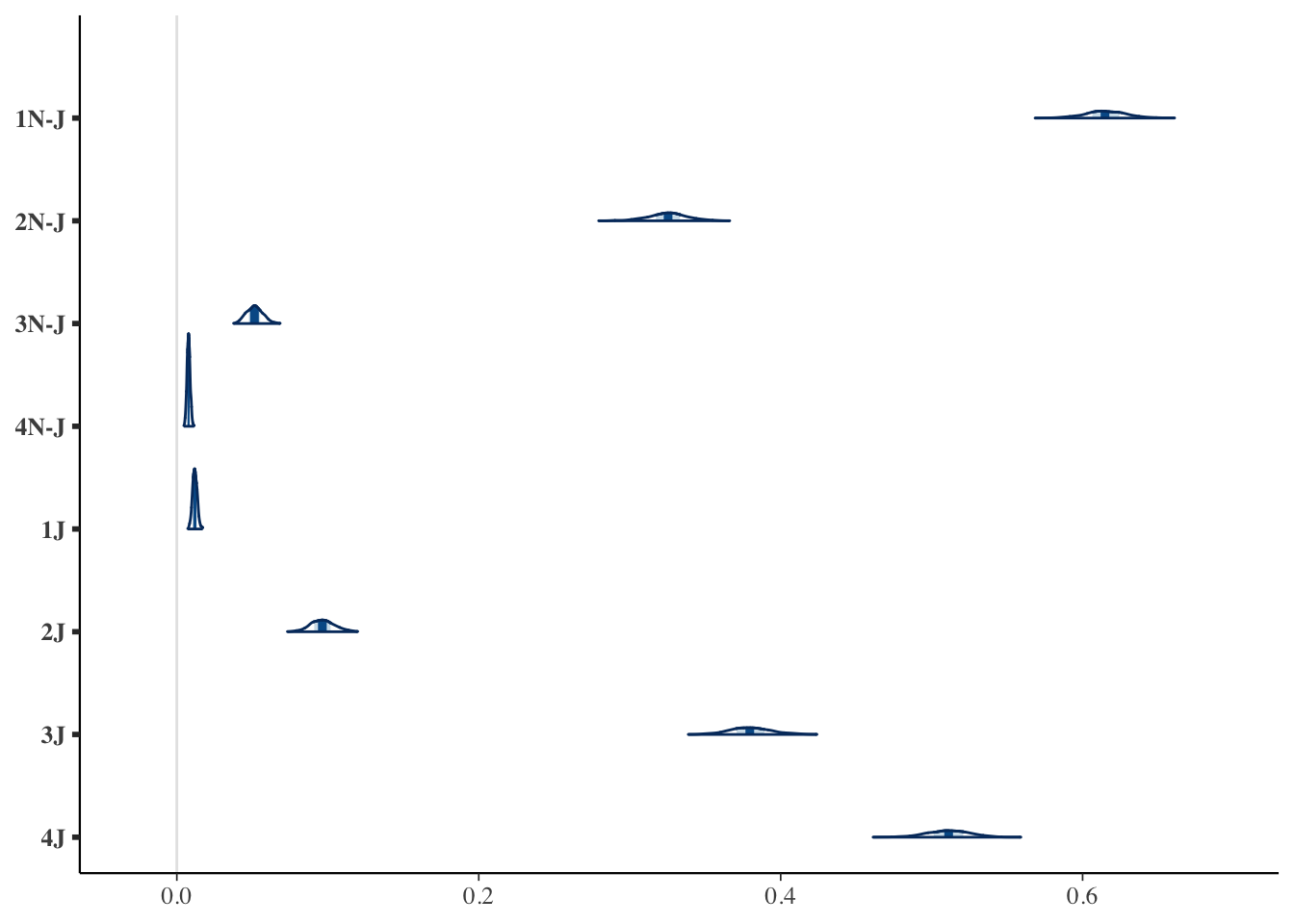 The benefit of an MCMC approach is that rather than just estimating probabilities, we can estimated their posterior distribution, providing a more intuitive understanding of the model estimate and error.