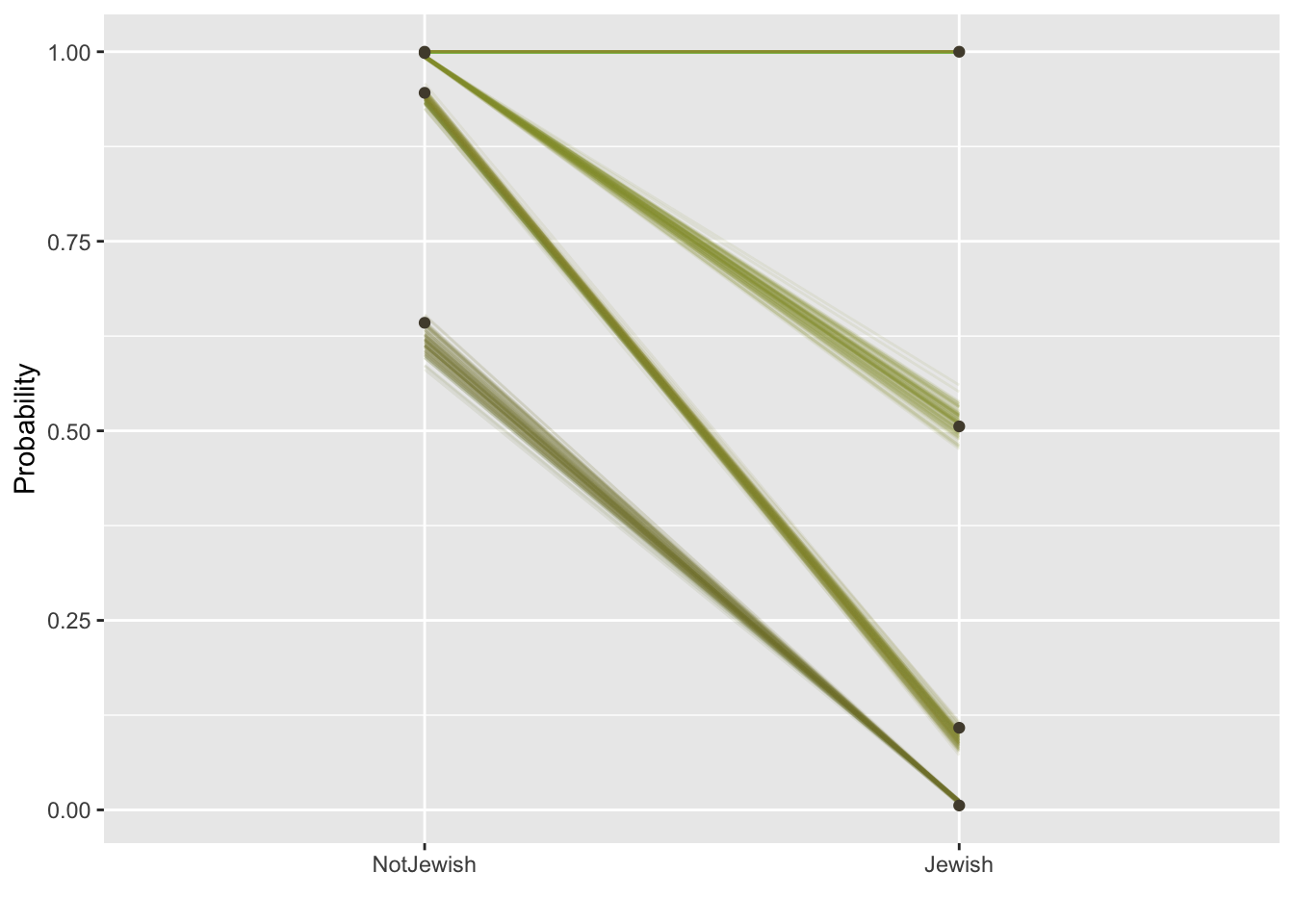 nd =data.frame(jewish =c("Jewish", "NotJewish"))fitted_df =fitted(b2, newdata = nd, summary =FALSE)fitted_df2 <-rbind(fitted_df[, , 1], fitted_df[, , 2], fitted_df[, , 3], fitted_df[, , 4]) %>%data.frame() %>%set_names(pull(nd, jewish)) %>%mutate(response =rep(1:4, each =n() /4),draw =rep(1:1000, times =4)) %>%pivot_longer(-c(draw, response),names_to =c("jewish"),values_to ="pk") %>%mutate(jewish = jewish %>%factor(., levels =c("NotJewish", "Jewish")))plot_df = fitted_df2 %>%# this will help us define the three panels of the triptychmutate(facet =factor(str_c("jewish=", jewish))) %>%# these next three lines allow us to compute the cumulative probabilitiesgroup_by(draw, facet, jewish) %>%arrange(draw, facet, jewish, response) %>%mutate(probability =cumsum(pk)) %>%ungroup() %>%# these next three lines are how we randomly selected 50 posterior drawsnest(data =-draw) %>%slice_sample(n =100) %>%unnest(data) %>%mutate(group =paste0(draw, response))# plot!library(ggthemes)ggplot(data = plot_df, aes(x = jewish, y = probability)) +geom_line(aes(group =as.character(interaction(draw, response)), color = probability),alpha =1/10) +geom_point(data = df %>%# wrangle the original data to make the dotsmutate(jewish = jewish %>%factor(., levels =c("NotJewish", "Jewish"))) %>%group_by(jewish) %>%count(familiarity) %>%mutate(probability =cumsum(n /sum(n)),facet =factor(str_c("jewish=", jewish))),color =canva_pal("Green fields")(4)[2]) +scale_color_gradient(low =canva_pal("Green fields")(4)[4],high =canva_pal("Green fields")(4)[1]) +xlab("") +ylab("Probability") +theme(legend.position ="none")